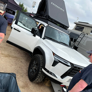 Stepping onto the grounds, the energy hits you immediately. It’s like a massive campground, a living gallery of every type of overland rig imaginable. There was everything there, from meticulously built and self-made rigs to full-blown EarthRoamers, massive in size and ready to conquer the wilderness. We saw everything from nimble Tacomas, 4Runners, Land Cruisers, and Lexus builds to rugged Jeeps, Broncos, GMC Canyons, and Chevy Colorados. Full-size builds including Tundras, Chevys, Fords, and Rams were abundant, and we even saw a Cybertruck with a bed camper pulling an offroad camper. We also saw the unexpected, like the Chrysler Pacifica Grizzly Peak Concept, and adventure bikes galore.